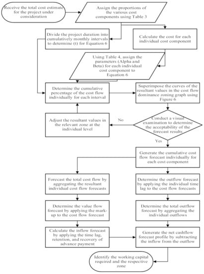 In the construction industry, cash flow has been recognized as a serious issue that adversely affects the performance of contracting organizations for decades, according to [,]. From a contractor’s perspective, the cash flow forecasting (CFF) process is concerned with periodically predicting the cash outflow (i.e., cost) and the cash inflow (i.e., revenue) to determine the net cash flow profile (i.e., the variance between the inflow and outflow) []. A positive net cash flow indicates that the project is able to finance itself, whereas a negative net cash flow indicates that working capital from outside a project is required []. Hence, it is critical for a contracting organization to forecast the working capital for a given project at the tendering stage, as well as during the construction stage, to ensure the financial functionality at the strategic level [] (p. 232).