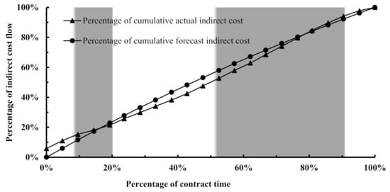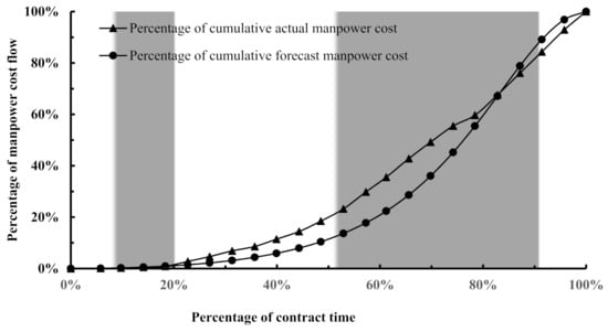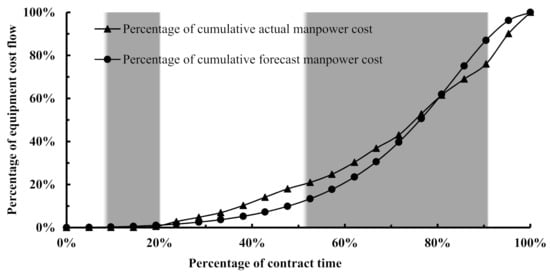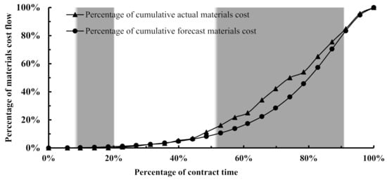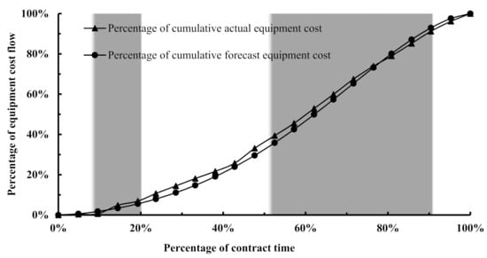 Table 5 indicates relatively high SDY values for the materials and manpower cost flows compared to the SDY values for the equipment and indirect cost flows; however, the SDY values have been found to be in line with the acceptable ranges reported in [] (p. 55). To visually determine the zone at which the substantial variance has taken place that has contributed to the high SDY values, the forecast and the actual cost flows of those two components have been superimposed on the zoning graph, as demonstrated in Figure 14 and Figure 15.