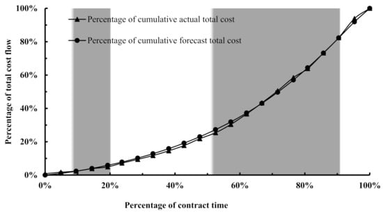 Following the steps of the flowchart illustrated in Figure 7, the cumulative cost flow forecast curves of the case study have been derived so as to perform an initial test for the model. The resultant forecast curves (i.e., the fitted curves) along with the actual curves are visualized in Figure 8, Figure 9, Figure 10, Figure 11 and Figure 12 on the dominance zoning graph presented in Section 4.2 to draw a comparison between the actual and forecast cost flows on a common platform and to determine the zone at which the under/over forecast has taken place.