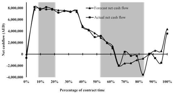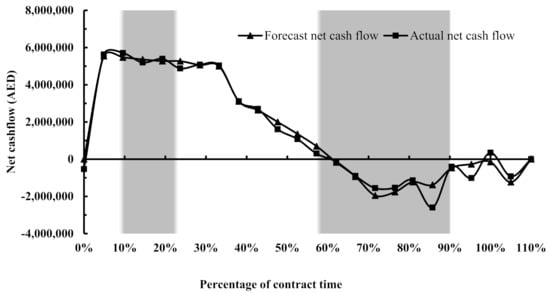 A visual examination of Figure 13 reveals that the net cash flow profile resulting from the developed cost flow forecast model has demonstrated a promising ability to forecast the net cash flow, as the trend of the forecast profile has conformed to the actual profile, in general. However, variances are observed at the end of the tertiary zone and during the quaternary zone, whereas during the primary zone, the model was unable to forecast the cash-out paid to the insurance, which is denoted by a negative value. This is attributed to the smoothing generated by the logit transformation technique on the actual cost flow trends when the fitting parameters were generated. Consequently, a forecast with relatively high accuracy for the required working capital denoted by a negative value can be derived.