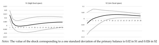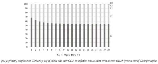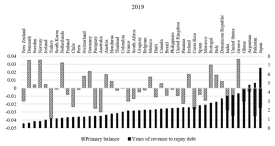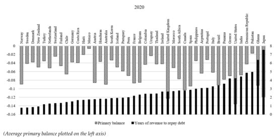 - Level of Primary Balance/GDP (%): data for primary balances are retrieved from the dataset of Mauro et al. [57]. Missing data are completed from various databases, such as the OECD, the World Bank, and the MOxLAD database for Latin American economies, available online: http://moxlad.cienciassociales.edu.uy/en (last access on 31 May 2021).