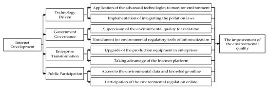 Environmental pollution control is a systematic project. The Internet, a technology with unique advantages of the cross space and time information dissemination, acquisition, and application, promotes the progress of whole society technology and provides the technical support for an environmental protection information-sharing mechanism. Overall, the development of the Internet facilitates the integration of strict and efficient environmental supervision, law enforcement, and real-time supervision of public environmental pollution, which directly impacts environmental quality through four angles: technology-driven, government governance, enterprise transformation, and public participation (Figure 1).