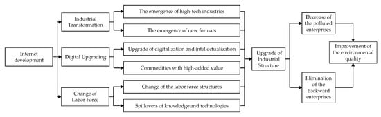 The impact of the Internet technological progress on the optimization and upgrading of the industrial structure is far-reaching and lasting [40], and the upgrading of technological innovation can promote industrial restructure [41]. During the process, the influence mechanism of the Internet on environmental quality through the industrial structure includes (Figure 2):