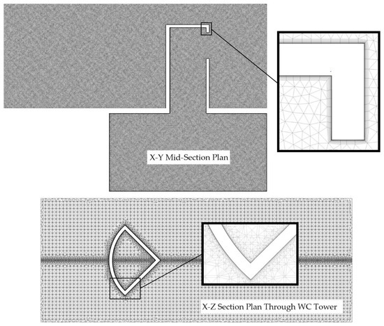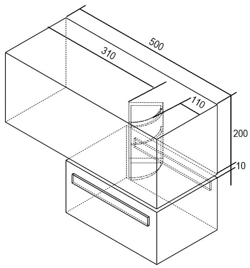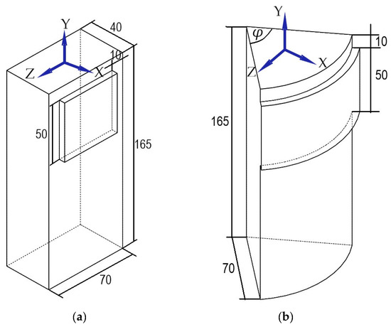 The physical geometries were designed for the basic and new models using SOLIDWORKS 2017 software and were imported into ANSYS Workbench via the geometry option to generate the computational domains. Figure 1 illustrates the dimension details of the basic and new windcatcher models. The basic model was a traditional one-sided windcatcher with a square inlet opening and a rectangular duct, which was adopted from Ref. [15]. In order to avoid the wind direction sensitivity problem from the previous one-sided windcatcher [12,13,14,15,16], a curved inlet opening embedded into a partial cylindrical duct was employed. As depicted in Figure 1b, the new windcatcher model can capture the mainstream flow at variable wind directions from 0 to 45 based on the x-axis direction. As shown in Figure 2, the performance of the new windcatcher was examined for three different orientations with respect to the same ventilated room, namely leading-down, central-up, and trailing-down. In addition, the ventilated room dimensions were evolved from a previous experimental model [12] with some modifications. The ventilated room had two exit openings located on the opposite side walls as recommended by Alsailani et al. [34]. The volume of both the basic and new windcatcher models was about 6% of the volume of the ventilated room.