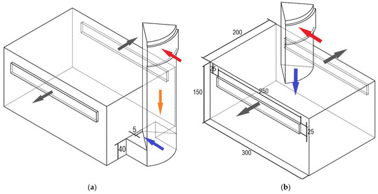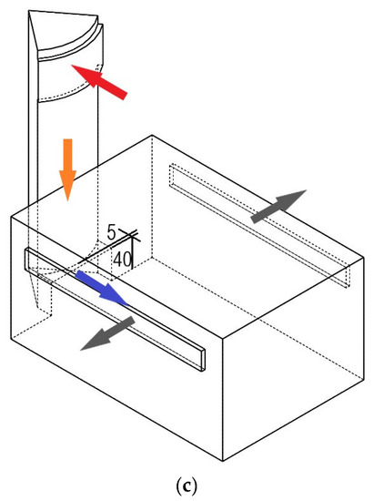Isometric drawing of the new windcatcher model mounted on a ventilated room with two typical side exit-openings at different feeding orientations: (a) Leading-down; (b) central-up; (c) trailing-down. Dimensions are in millimeters.