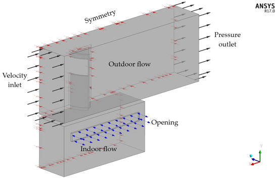 For all cases, the computational domain consisted of the outdoor and indoor airflow through the windcatcher and the ventilated room as shown in Figure 3. The upstream and downstream domain lengths of the outdoor airflow were 110 and 310 mm, respectively, based on what was applied for model validation. The computational domain was solved at the specified boundary conditions that simulate the outdoor mainstream flow and the indoor airflow through the windcatcher and the room. Details of the CFD model boundary conditions are described in Figure 4. As depicted in Figure 4, the outdoor airflow speed was varied from 1 m/s to 5 m/s, which was directed toward the positive x-axis. The turbulence intensity was 1% (a lower value than [18]) and the fluid domain was kept at the isothermal temperature of 25 °C as presented in Table 1. As a result of the wide inlet opening of the new windcatcher, a large quantity of the mainstream was captured and driven to the room due to the pressure difference generated in the windcatcher tower. The outlet condition was set at an average static pressure of 100,700 Pa according to the climate conditions of Taif City [36]. The induced ventilated air leaves from the exit opening at a relative pressure of 100,700 Pa. The half-section boundary of the whole fluid domain was set as symmetrical. All the other walls were assumed to be of a no-slip condition. In order to describe the flow features around and inside the different windcatcher models, the following parameters are defined. The effect of the new design of the inlet openings on the ventilation performance can be evaluated using the dimensionless velocity magnitude V/U0. U0 is the reference velocity of the upstream airflow. The static pressure coefficient Cp is calculated using Equation (1) as: