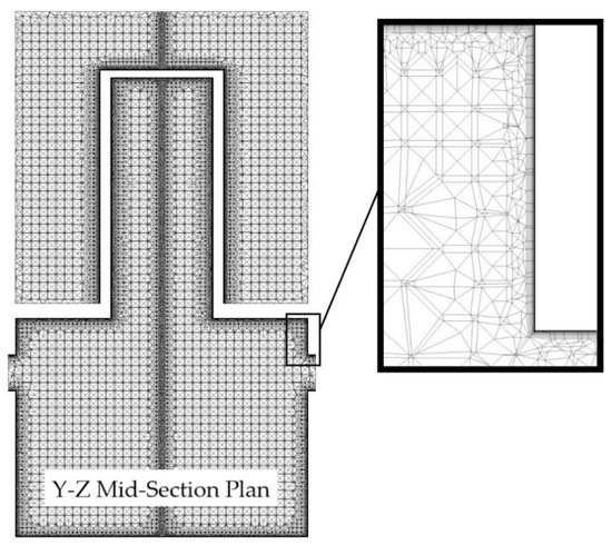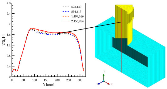 An unstructured grid was employed to discretize the computational domain using the ANSYS ICEM package. Figure 5 illustrates the details of the generated mesh (very fine) for the central-up windcatcher model. In order to capture the flow field accurately, the grid was refined for the significant areas of interest in the current study, such as the windcatcher and room walls. A mesh independency check was performed to verify the computational domain, as depicted in Figure 6 and Figure 7. The sensitivity check was carried out by applying the same simulation procedure for four different mesh node numbers from 0.5 million (coarse) to 2.1 million (very fine), and the generated results were analyzed. Table 2 presents the average dimensionless velocity values corresponding to the different grids. As depicted in Figure 6, the velocity profiles for the last two mesh node numbers were very similar. Furthermore, the percentage error of the results increased initially and then decreased by increasing the mesh node numbers to reach the lower value of 1% as introduced in Table 2. Thereby, the grid with 2.1 million and beyond was applied for all simulations. The grid refinement near the target walls used 15 prism layers with the first layer height of 0.001 mm and a height ratio of 1.2. Moreover, the dimensionless wall distance value (Y+) of the first layer was less than unity.