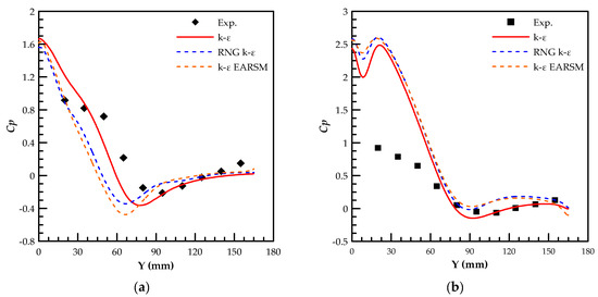 The accuracy of the numerical results was evaluated using the most suitable turbulence model, which achieved reasonable agreement with the most pertinent experimental data. Three turbulence models were used to predict the experimental data at a free stream velocity of 10 m/s, as shown in Figure 8. As depicted in Figure 8, the k-epsilon model showed better agreement with the experimental results than the other turbulence models. Furthermore, many previous related studies [9,11,35,37,39] confirmed the superiority of this turbulence model in predicting the flow behavior inside the windcatcher. Therefore, the k-epsilon turbulence model is applied for all simulations in the present work.