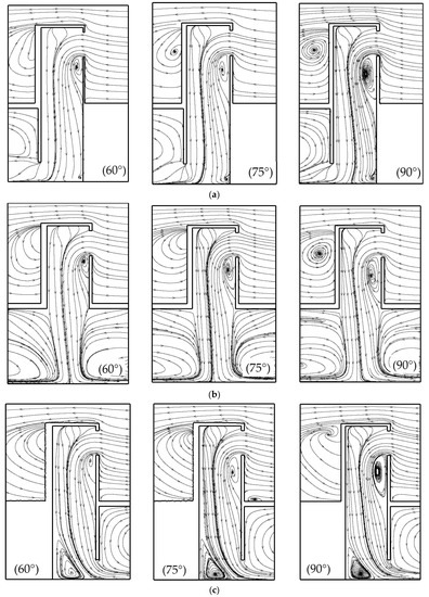 Figure 10 illustrates the flow patterns for all cases, in terms of velocity streamlines on the symmetrical plane at the different inlet opening angles for different feeding orientations. Generally, the flow separation and recirculation zone increase directly downstream of the inlet opening due to the sharp edge. Furthermore, they increase with the increase in the opening angle from 60° to 90° as depicted in Figure 10. At the same opening angle, there is a small corner vortex at the end of the windcatcher tower as shown in Figure 10a. Additionally, the reattachment after flow separation occurs in the opposite direction to the windcatcher exit opening. In the case of the central-up orientation, the indoor flow impinges on the room floor and creates two opposite vortices as indicated in Figure 10b. In Figure 10c, there is an additional large corner vortex at the end of the windcatcher tower, which turns the flow direction toward the ventilated room. The dimensionless velocity profile in Figure 9c can be attributed to the flow reattachment in the same direction as the descending flow trajectory toward the windcatcher exit opening as shown in Figure 10c.
