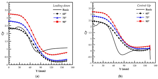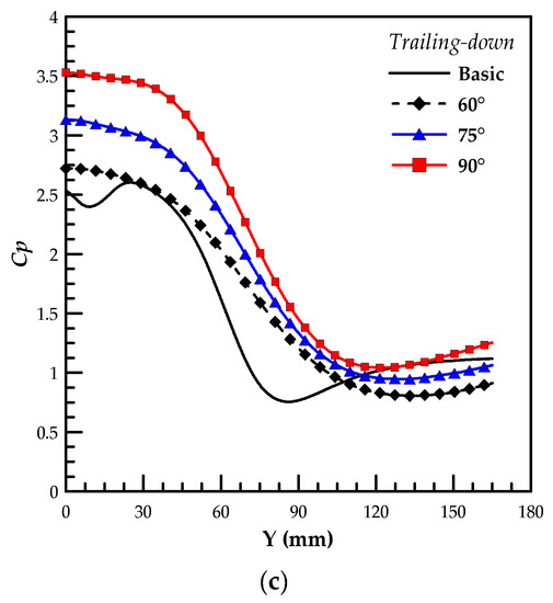 The static pressure coefficient determines the ratio of the local surface pressure and the dynamic pressure as presented in Equation (1). Figure 11 indicates the variations of static pressure coefficient on the intersection line of the leeward surfaces for all windcatcher models for different feeding orientations under a constant wind speed. As depicted in Figure 11, all new models generate pressure coefficients with maximum values (positive values) that decrease due to the indoor flow acceleration. Then, a sharp decrease occurs further downstream along the windcatcher tower until the minimum values are reached at Y = 120 mm due to the flow separation, as shown in Figure 10. After that, the pressure coefficients slightly recover again toward the end of the windcatcher tower as shown in Figure 11. Moreover, the pressure coefficient variations increase with the increase in the opening angle from 60° to 90° due to the increase in the recirculation zones, which increase the static pressure of the inlet-opening surface. Based on the feeding orientation parameters, all of the new windcatcher models have high-pressure coefficient distributions, except at φ = 60°, compared to the basic model, as indicated in Figure 11a. For the central-up models, almost all of the new models have the highest distributions of Cp compared to the basic model, as depicted in Figure 11b. In Figure 11c, the new model at φ = 90° achieved the highest values of Cp compared with all the other windcatcher models.