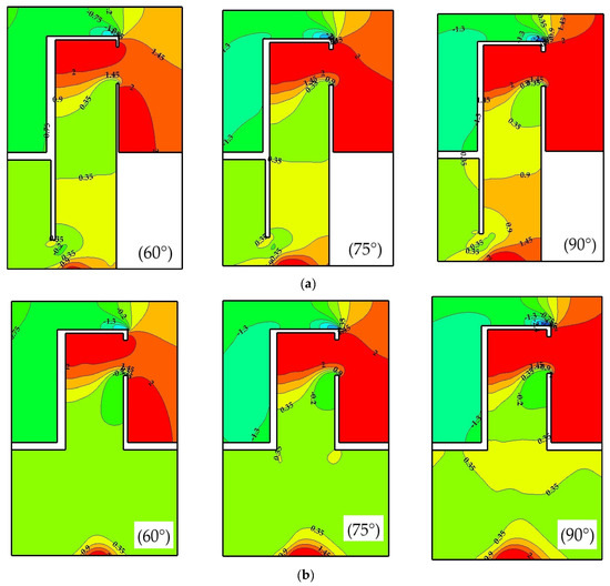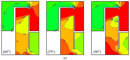 The contours of the static pressure coefficient distributions for the symmetrical plane of the new windcatcher models at different opening angles and different feeding orientations are presented in Figure 12. As described in this figure, the contours of Cp reflect the same behavior of all windcatcher models that are presented in detail in Figure 11. It can be concluded that the new windcatcher model with a 90° opening angle has the highest Cp distributions, which can induce more airflow inside the ventilated room with a trailing-down feeding orientation as shown in Figure 12c.