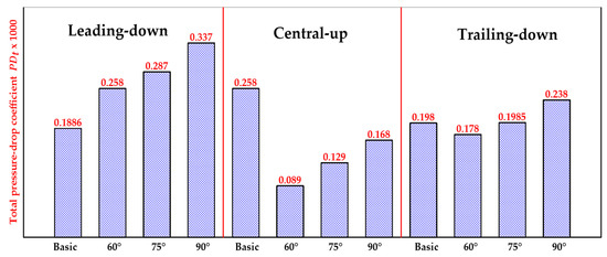 Figure 13 introduces a bar chart of the total pressure drop coefficients at different opening angles and different feeding orientations. The total pressure-drop coefficients increased with the increase in opening angles for all new windcatcher models. Comparing the different feeding orientations, the leading-down orientation produces the highest pressure-drop values compared with the other models. Furthermore, the minimum and maximum values of the total pressure drop are found in the central-up-60° model and leading-down-90° model, respectively.