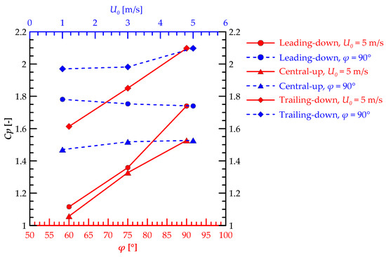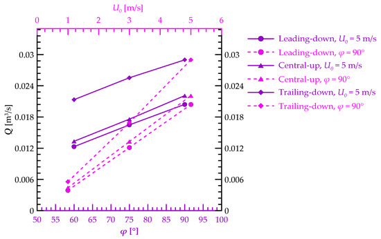 To summarize the results, Figure 15 and Figure 16 describe the effects of the main factors affecting the ventilation performance of the new windcatcher models. As depicted in Figure 15, the length-weighted average static pressure coefficient clearly increases with the increase in opening angle for all different feeding orientations at the same wind speed. In addition, when the wind speed increases, it leads to an increase in the pressure coefficient for all models except for the central-up windcatcher model at identical opening angles. Moreover, at the fixed conditions of φ = 90° and U0 = 5, the trailing-down model has a higher pressure coefficient than the leading-down and central-up models by 20.55% and 37.37%, respectively. Furthermore, the trailing-down windcatcher model could achieve a superior ventilation rate compared to the central-up model and leading-down model by 31% and 42%, respectively. This may be attributed to the flow acceleration through the windcatcher tower in the same flow path toward the exit opening as shown in Figure 10c. Based on the above analyses, the trailing-down windcatcher model can be recommended as the best choice to provide natural ventilation in the selected target area.