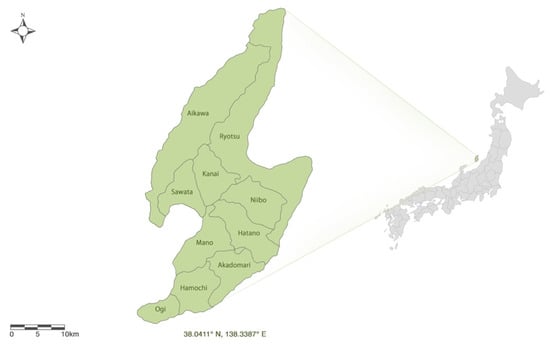 The study was conducted in Sado Island, which is located west of the Niigata prefecture shoreline (Figure 2). It is the sixth largest island in Japan, and has a complex ecosystem, with interdependent satoyama and satoumi landscapes. It is widely known as a natural habitat of endangered Japanese crested ibises (locally called Toki in Japanese) because of its satoyama and satoumi landscapes. The Japan Satoyama Satoumi Assessment (JASS) defines the former term as “landscapes that comprise a mosaic of different ecosystem types including secondary forests, agricultural lands, irrigation ponds and grasslands, along with human settlements” and the latter as “Japan’s coastal areas where human interaction over time has resulted in a high degree of productivity and biodiversity” [12] (p. 2). Sado Island is also famous for its rice produce with the Toki branding, which supports the revival of the Toki birds [26]. Other agricultural crops are also grown, such as persimmons, apples, pears, cherries, oranges, strawberries, watermelons, shiitake mushrooms, among others. Since the island provides suitable habitats for the endangered Toki birds, public and private sectors poured in efforts to support Sado Island’s biodiversity preservation through the environmental conservation agriculture (ECA) program [27], which was a huge factor in its designation as a GIAHS.