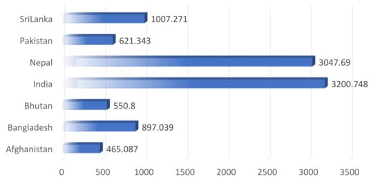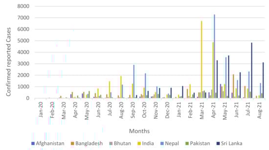 The COVID-19 epidemic quickly spread to every country in the world and left the world paralyzed. However, there are some notable variations in the behavior of COVID-19 in different regions. As of 17 September 2021, there were approximately 37.42 million COVID-19 infections recorded, which equates to an average of 74,391 cases per million population, with the highest readings in India and Nepal []. Several pharmaceutical and non-pharmaceutical policy measures are being implemented by governments around the world to prevent the COVID-19 pandemic. Pharmaceutical measures include vaccinations and non-pharmaceutical measures include containment measures including border closures, school closings, restrictions on public transport and air travel, contact tracing, testing policy, quarantine and isolation in countries that constitute the largest economies in the world [,]. Figure 1 shows the maximum reported cases of COVID-19 per million people in a month in South Asia. In addition, Figure 2 depicts the monthly reported cases of COVID-19 per million population in South Asia.