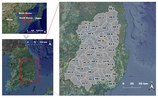 The Nakdong River is 506.17 km long and has a watershed area of 23,384.21 km2, making it the longest river in Korea, accounting for about 24 % of the country. There are about 780 rivers and seven large multi-purpose dams in the basins located in the southeast of the Korean peninsula (127° E to 129° E and 35° N to 37° N). The Nakdong river basin is divided into four major geological categories: upstream (all or part of 16 cities and counties including Taebaek and Gumi), midstream (all or part of 20 cities and counties including Daegu and Gyeongsan), west downstream (all or part of 13 cities and counties including Jinju), and east downstream (All or part of 16 cities and counties including Busan and Miryang). About 6.7 million people also live in the Nakdong river basin. Therefore, each category includes urban, agricultural, and industrial areas [34].