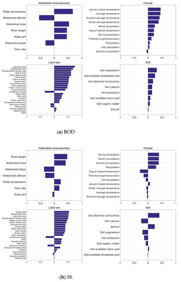 BOD showed high correlations with water temperature, watershed area, watershed altitude, residential area, industrial area, transportation facility area, public facility area, golf course, inland wetland, inland water, and ocean water (more than 0.5 or less than –0.5). In particular, the correlation coefficient with the industrial area was the highest at 0.74. The correlation coefficients of SS was low overall, with the largest value being 0.53. Residential area, industrial area, transportation facility area, and paddy field showed high correlations, while watershed area, river length, public facility area, plastic vinyl house, and soil electrical conductivity also showed relatively high correlations (more than 0.4 or less than –0.4). The correlation coefficients of TN showed high correlations with precipitation, fall precipitation, industrial area, commercial area, transportation facility area, and soil available phosphate acid, while transportation facility area was the highest at 0.68. The correlation coefficients of TOC showed high correlations with water temperature, watershed area, watershed altitude, watershed slope, river length, summer average temperature, industrial area, golf course, inland wetland, inland water, and ocean water. It showed a high negative correlation of –0.67.