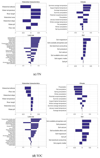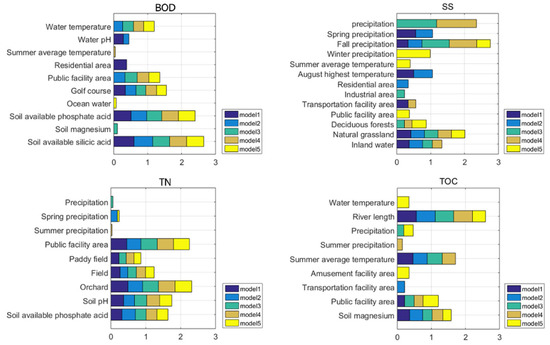 In the models for TOC, the influence was highest starting with river length, summer average temperature, soil magnesium, public facility area, and finally precipitation. The influence of river length was 0.56, while the influence of summer average temperature and soil magnesium was more than 0.3. It can be recognized that the predictors in the climate, land use, and soil families, as well as the family of watershed characteristics, have various influences on TOC concentrations in the river.