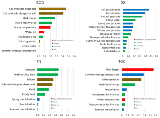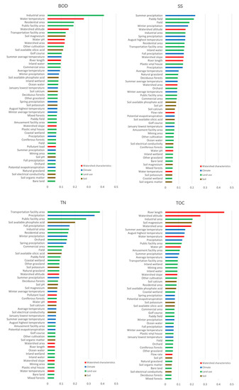 Key predictors affecting BOD were water temperature in the watershed characteristics family, and soil available phosphate acid and soil available silicic acid in the soil family. Key predictors affecting SS have all been identified in the climate family: precipitation, spring precipitation, and fall precipitation. Key predictors affecting TN were public facility area, orchard, and field in the land use family, and soil pH and soil available phosphate acid in the soil family. Key predictors affecting TOC were river length in the watershed characteristics family, summer average temperature in the climate family, public facility area in the land use family, and soil magnesium in the soil family.