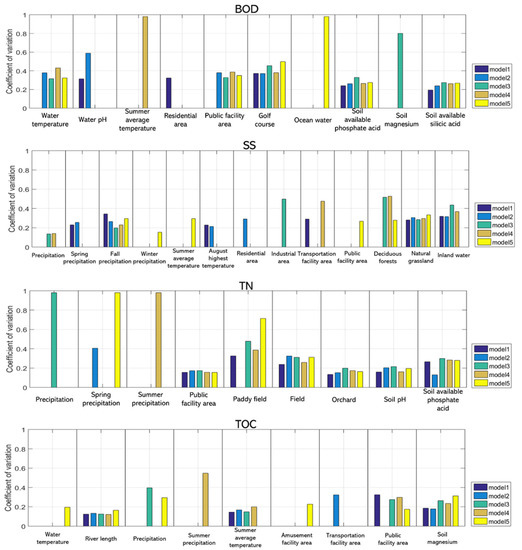 In order to adopt the main predictors that have a relatively large impact among the selected predictors that affect river water quality concentrations, uncertainty of the predictors along with their influence should also be considered. To compare the uncertainties of various predictors with each other, a coefficient of variation was calculated from the posterior distribution of the regression coefficients corresponding to each predictor. Figure 6 shows the coefficient of variation in the predictors. Overall, we found that regression coefficients corresponding to highly influential predictors were less uncertain.