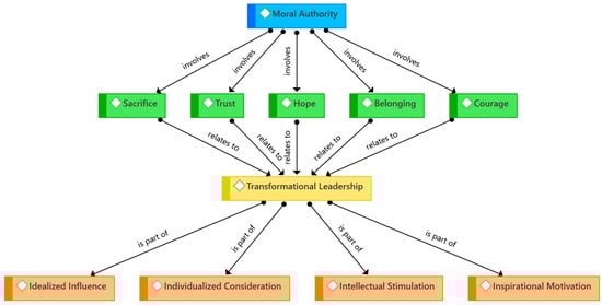 By applying transformational leadership theory (TL), this study refers to the five typical characteristics of moral authority, as discussed by various scholars [8,9,27,28,29,30,31]. Figure 1 presents the applied theoretical framework, showing different key concepts used in ATLAS-ti.v.9, Scientific Software Development GmbH, Berlin, Germany, as codes during the systematic analysis of the data. The upper part of Figure 1 presents the five identified characteristics of moral authorities: sacrifice, hope, trust, belonging, and courage. The lower part presents the four elements of TL: idealized influence, individualized consideration, intellectual stimulation, and inspirational motivation.