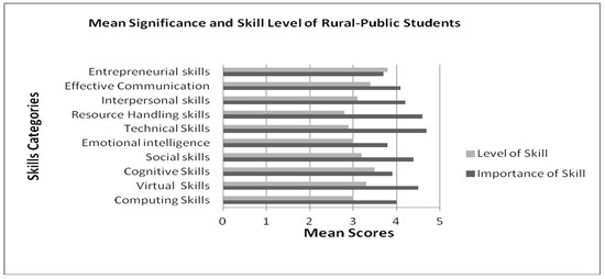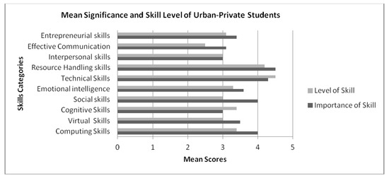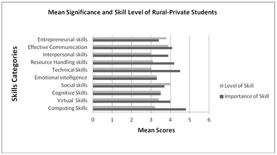 Figure 3 depicts the mean scores of those students who live in the rural areas and study in the private vocational institutions. The results indicate that the students give maximum importance to their technical and computing skills for early employment; however, their own competency levels in these skills are low. On the other hand, they consider that their communication and social skills are very good, but they perceive these skills as less important for procuring them jobs. The findings are further supported by Riemer, who highlights the role of communication skills as a key player in defining a robust and sustainable career for 21st century engineering graduates [43].