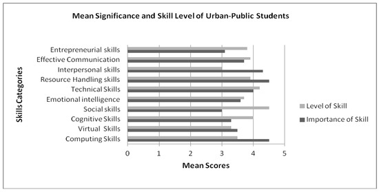 Figure 2 shows the mean values of the perceived importance and competency levels of those students who live in urban vicinities and study in the public vocational institutes. The results indicate that, according to students’ perception, their computing and resource-handling skills are the most important skills for procuring jobs. However, at the same time, they do not rate themselves as very good in these skills. On the other hand, they consider that their social and entrepreneurial skills have minimul roles in procuring them early employment. However, despite this fact, they rate their competency levels in these skills as very good. The findings share a common similarity with the research of Zaharim et al., in which the students felt confident about their resource-management competencies and underscored the importance of these skills for a secure and sustainable future [42]. The mean value of each skill also highlights the hindrances of vocational urban/public students in procuring an established career path.