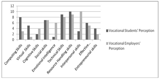 Figure 5 shows the perception gap between vocational students and vocational employers with regard to the importance of skills. It is clear that the maximum gap exists between interpersonal and emotional intelligence and virtual skills, while the minimum gap exists between social, technical, and resource-handling skills. However, a significant perception gap also exists between entrepreneurial, computing, and cognitive skills.