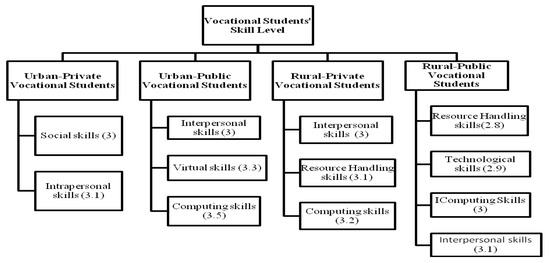 Figure 6 indicates the skill levels of students in each of the four clusters of urban/private, urban/public, rural/private, and rural/public students. It is observed that urban/private students showed low levels of competency in social (3) and intrapersonal skills (3.1). Similarly, vocational students studying in public vocational institutes, but living in urban vicinities, expressed their partial low competency levels in interpersonal skills (3), virtual skills (3.3), and computing skills (3.5). Likewise, rural/private students showed low levels of competency in interpersonal skills (3), resource-handling skills (3.1), and computing skills (3.2). However, extremely low levels are witnessed in rural/public vocational students in resource-handling skills (2.8), technical skills (2.9), computing skills (3), and interpersonal skills (3.1). The results of the hierarchical analysis are further supported by the work of Triyono et al., which identified that the socioeconomic backgrounds of vocational students not only affected their competency levels, but also created a significant difference towards sustainable careers [44].