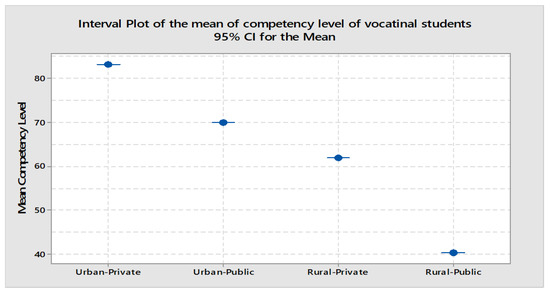 Figure 7 indicates the interval plot of the student’s mean competency levels. It is evident that the students living in urban areas and studying in private institutes have expressed the highest levels of competency scores in the cluster of these skills (83.2%), whereas the competency score of the urban/public students has shown a sharp decline (70%). On the other hand, the students who live in the rural areas, but study in the private vocational institutes, scored 61.9% in the skills competency. However, the students belonging to rural areas and studying in the public vocational institutes scored low, showing the lowest levels of competency in these skills, which is recorded as merely 40.4%. These results are in accordance with the study conducted by Andrew and Hingson that revealed the importance of alignment between soft and technical skills for progressive and sustainable advancements in their initial careers [45].