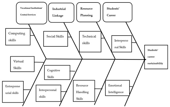Figure 8 shows the cause-and-effect analysis of the perceptions of vocational students, and their competency levels for sustainable career adaptability, with the help of the Ishikawa diagram. As is evident, the four effects of central services, teaching methodology, resource planning, and career development on vocational students are linked with the ten causes. The figure shows that the vocational institutions’ central services and teaching methodologies can play dominant roles in the career adaptability of vocational students as compared to resource planning and the students’ career development.