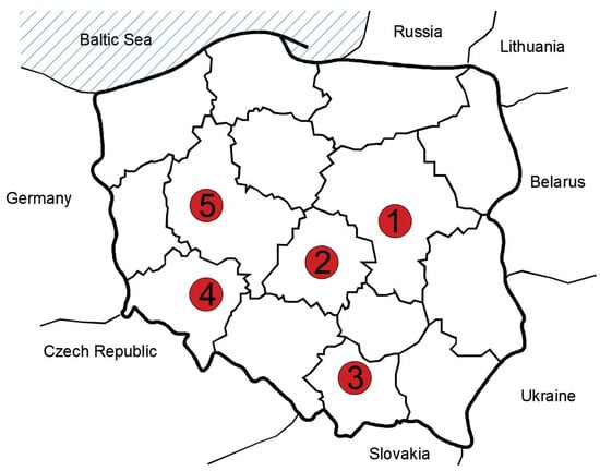The location of the selected large Polish cities: 1-Warszawa, 2-Lodz, 3-Poznan, 4-Wroclaw, 5-Krakow.