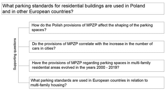 The next stage of the study consisted of literature research on the experience of Western European countries in the context of parking standards for residential buildings. Taking into account the rapidly growing number of cars, as well as the intensive expansion of the housing sector deship cities, the main research question and supporting questions posed before starting the research work are shown in Figure 2.
