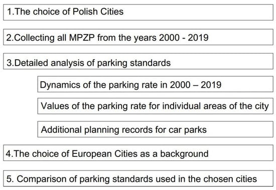 The following structure of the work was adopted in the article: the first part presents a broader background to the conducted research. The next part presents the methodology and scope of the research. Section 3 introduces the ideas which emerged in Great Britain, Germany and Sweden—for carrying out the transportation policy, with particular emphasis on the parking policy for housing estates. Section 4 presents research based on the analysis of planning documents carried out for local development plans adopted in five major Polish cities—Warszawa, Poznan, Krakow, Wroclaw and Lodz—over the period of 2000 to 2019. The collected data allow for a summary and opening of the discussion on parking standards in Polish cities in relation to the experiences of other European countries.