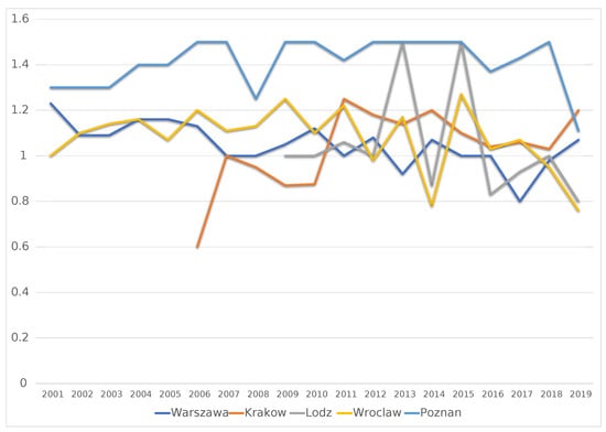 For each of the five selected cities, the annual average parking rate for multi-family housing was calculated (the number of parking spaces per apartment), and then individual results for subsequent years were compared. The results are presented in Figure 4. There are differences in the size of the rate for specific cities. Definitely the highest minimum rates were adopted in Poznan, since 2000 the rate has remained stable at the level above one parking space per apartment. In the analyzed period of time, Poznan always had the highest result among all cities. In Wroclaw and Warszawa, the rate hovered around 1.0, and the trend line shows a slight decrease. On the other hand, Krakow is a city with an increase in the minimum rate in the years 2000–2010 and the stabilization that follows. On the basis of the collected material, it is not possible to establish trends in the value of the minimum rate in subsequent years. It should also be noted that the scope of the rate in the analyzed five cities covered a relatively narrow range. However, there are visible differences resulting from the parking policy of individual cities.