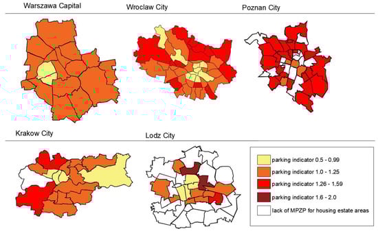 In Warszawa and Poznan, the average parking rate for individual areas is practically the same. For Warszawa, apart from two districts, it ranges from 1.0 to 1.25. Poznan plans have the highest index, which is characteristic of the statistical summary and is shown in Figure 5. Outside the city center, the rate ranges from 1.26 to 1.59. In other cities (Wroclaw, Krakow, Lodz), a decrease in the rate is visible in the quarter development zone which covers the city center and an increase in other further housing estates. In Wroclaw, the highest rate was adopted for peripheral estates, where access to an efficient public transportation system needs to be developed. An interesting example is also Lodz, which is the only city that allows a minimum parking rate of a high value of 1.6–2.0. The summary is presented in Figure 5.