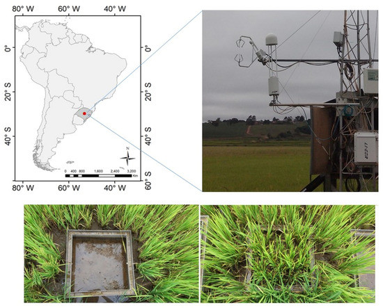 For this study, the 2015/2016 rice-growing season and following fallow period were evaluated. A late-cycle rice cultivar (Epagri 118) was planted on 5 November 2015, and harvested on 16 April 2016. Planting was carried out with pre-germinated seeds broadcast by airplane onto the flooded field with a standing water depth of 5 cm. The soil remained flooded with 5–10 cm of standing water during the growing season until one week before the harvest, and flooding was maintained by pumping water from the nearby river. The amount of N fertilizer applied was 68 kg N ha−1, being in agreement with official technical recommendations for this region [36]. The average rice yield (Y) from the analyzed crop was 0.45 kg m−2 (4.5 ton ha−1). The rice phenological stages were estimated using the degree-day method [37]. This experimental site represents the rice paddy management system currently adopted by most farmers in southern Brazil.