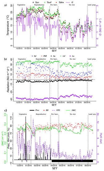 Climatically, precipitation is well distributed throughout the year in the study region [35,38], varying from 83.9 mm (April) to 157.4 mm (August). On 22–23 December 2015, the daily accumulated precipitation amounted to 115 and 94.2 mm, respectively (Figure 2c). After that there were nearly 30 days of no recorded precipitation. The regular precipitation returned in February 2016. Unfortunately, there was a long period without precipitation data collection in the experimental site due to equipment failure (after 25 March 2016), which was identified as a negative value in Figure 2c. However, the flooding in the rice paddy does not depend on precipitation because it was maintained by pumping water from the nearby river. In general, RH is high because the rice paddies cover large areas within a catchment, creating a microclimate with high amounts of water available for evapotranspiration [61]. The lowest daily average of RH was 59% in the summer when little rainfall occurred. The highest vapor pressure deficit (VPD) values were in the rice-growing period and mainly due to the high air temperatures, exceeding values of 15 hPa [38]. The daily average soil water content (SWC) at 30 cm depth recorded a maximum value of 0.4 m3 m−3 and a minimum of 0.27 m3 m−3, being always above the soil field capacity, which is 0.21 m3 m−3 for this experimental site [35].