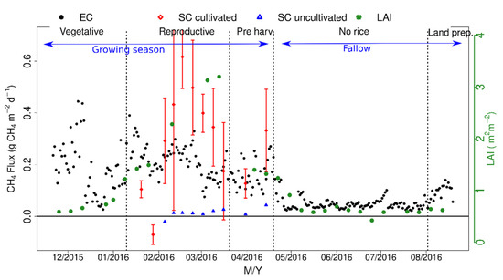 The CH4 fluxes measured by the SC (hereafter CH4(SC)) had similar seasonality to those obtained with EC, decreasing at the beginning of the reproductive stage and increasing until the middle of this period when CH4(SC) fluxes decreased (Figure 4). At the beginning of the reproductive stage, the first two weekly samplings with the soil chambers showed lower CH4(SC) flux values than those determined by EC (CH4(EC)) (including a negative value, −0.07 ± 0.04 g CH4(SC) m−2 d−1). From the third sampling on, the CH4(SC) values were almost always higher than CH4(EC), with maximum values of 0.61 ± 0.12 g CH4(SC) m−2 d−1. Therefore, the measurements of soil chambers represented well the seasonal variability of CH4(EC), increasing until half of the reproductive stage, shortly after decreasing. For the same period, uncultivated SC showed little variability in flux values with values around zero (maximum values of 0.04 g CH4(SC) m−2 d−1 and minimum values of −0.019 g CH4(SC) m−2 d−1). These values were similar to those obtained by EC during the fallow period, even without the water layer. Therefore, these results demonstrate the considerable emissions of CH4 of the rice paddies, as also highlighted by Holzapfel-Pschorn and Seiler [71] and Schütz et al. [72].