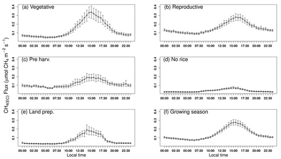 Mean diurnal pattern of CH4 fluxes measured by EC (CH4(EC)) and gap-filled with ANN for different sub-periods in the rice paddy. The growing season represents the combination of the vegetative, reproductive, and pre-harvest periods. The error bars represent the standard deviation.