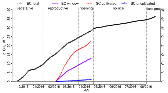 Schrier-Uijl et al. [32] proposed that the accumulated seasonal fluxes obtained by SC measurements can be calculated with models that consider the daily effects of temperatures on fluxes. However, in this study, we only used linear interpolation as it is the most widely used method and facilitates comparing results of other studies in the literature [16,76]. In the period that EC and SC measurements were performed simultaneously (5 February 2016, to 14 April 2016, totaling 70 days), the accumulated EC was 12.86 g CH4(EC) m−2, while the SC registered 22.5 g CH4(SC) m−2 for the cultivated plot and 1.1 g CH4(SC) m−2 for the uncultivated plot. Therefore, a SC for the cultivated plot measured a CH4 emission that accumulated 74% higher than the EC in the same period. Studies have shown that fluxes measured with the SC method are greater in flooded areas (e.g., irrigated rice) than those with the EC method, with variations between 20 and 90% [76,77,78].