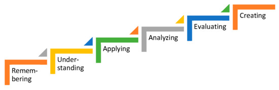 We classified the learning outcomes on the basis of cognitive and content dimensions. The cognitive dimension refers to the Bloom’s taxonomy (1956), which classifies thinking behaviors during the learning process and permits to identify six classes corresponding to increasing cognitive skills (knowledge, comprehension, application, analysis, synthesis, and evaluation). We referred to the new version developed in 2001, where the skills are translating into verbs (remembering, understanding, applying, analyzing, evaluating, creating) (Figure 1). Knowledge refers to remembering facts, terms, basic concepts, and answers. Comprehension is related to demonstrating a basic understanding of facts and knowledge. Application refers to applying the acquired knowledge in different contexts. Analysis corresponds to examining in detail and breaking information into parts by identifying causes, motives, and making inferences. Evaluation is related to developing opinions, judgments on something, and making decisions (evaluating) Finally, creating refers to compiling information together in new ways so as to create something new or propose alternatives.