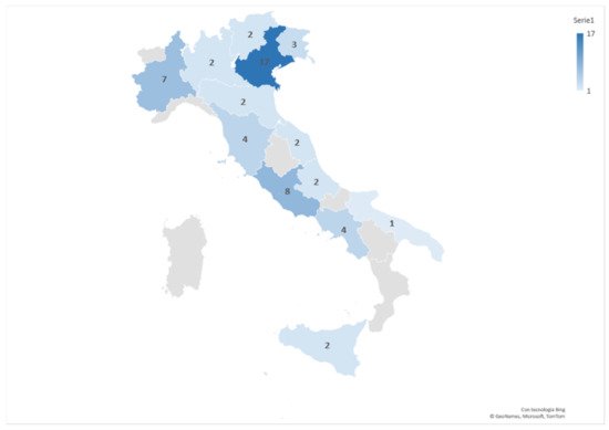 Table 3 and Table 4 display the CE programs/courses and the CE modules offered by Italian higher education institutions, respectively. Figure 2 shows that CE modules are offered in 13 out of 20 Italian regions: 33 CE modules are offered in Northern Italy, 16 in Central Italy, and 7 in Southern Italy.