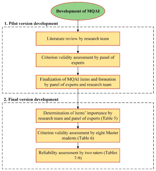 As previously mentioned, this paper shows the development process of the MQAI. This process included two main parts: (1) pilot version development and (2) final version development. Each part involved a series of assessments and techniques. The development process of MQAI is indicated in Figure 1.