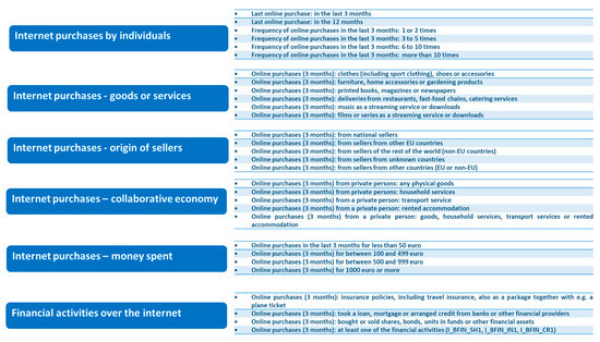 Given this scarcity of data, we thought of using Eurostat, which promotes the process of harmonization of statistical methodology among the states themselves. This tool was used in the literature [18,19] and was useful for comparing different countries [20,21]. On the Eurostat search engine, we looked for e-commerce as a keyword and we identified the following cascade process: within the topic “Science, technology, digital society” is “digital economy and society,” which in turn presents “ICT usage in households and by individuals,” and here we came to our keyword. There were 30 criteria divided into six categories (Figure 1):