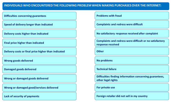 The data proposed above were identified to analyze RQ1. The next step was to identify the data useful for investigating RQ2. The identification of problems and barriers affecting Internet shopping could be gleaned from the literature or from field experiments designed to capture the critical issues highlighted by people. Based on the same method used in the previous step of the research, it was found that these aspects were already present in Eurostat and it seemed logical to use the same source. Consequently, all the potential responses that were proposed in the database were chosen, both for what concerns the problems that people have encountered when shopping on the Internet (Figure 2), and for what concerns the barriers, that is, the motivations that do not push people to make purchases on the Internet (Figure 3).