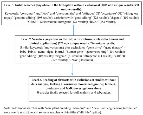 NPET terms included gene/genome editing, cisgenic, intragenic, ingenic, RNAi, and CRISPR. We searched for articles that included these terms and at least one of the following terms: consumer acceptance (or attitudes), or consumers’ willingness to pay, to purchase, to eat, or to consume the product. This search yielded 550 unique candidates, which were narrowed down to 294 unique results, using exclusion of terms related to human therapy and biofuel applications (see level 2 in Figure 1). We then read the article abstracts and further excluded articles with no data analysis, those not examining consumers, and those only covering GMOs (see Level 3 in Figure 1). This yielded 59 useable studies. During the reading of these articles, we double-checked their references to see if we missed any relevant articles in our searches. In the 59 useable studies, one was a meta-analysis (not generating any new data but formalizing the data process) and 58 provided analysis using original data collected for their respective investigations. Several investigations on consumer behavior and NPETs yielded more than a single article. Additionally, a number of investigations were international in nature and yielded WTP estimates for multiple populations. Among the 59 publications, 44 (75%) had gone through a formal journal refereeing process in a journal.