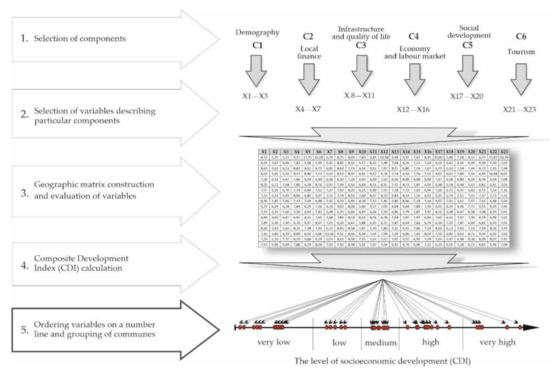 To achieve this objective and verify the above hypotheses, multivariate comparative methods allowing to analyze phenomena, which are simultaneously affected by a large number of characteristics (variables) and factors, are used. The Composite Development Index (CDI), based on one of the linear ordering methods, is constructed in order to compare the elements of the set described by many variables (characteristics). Linear ordering methods allow for determining the hierarchy of analyzed objects according to the adopted criteria, for example from the best to the worst developed ones. These methods have been improved, applied, and described by a number of authors representing the fields of statistics, geography, or economics. Attention should be given to major contributions made to this discipline by Polish researchers: J. Perkal [71], S. Leszczycki [72], Z. Hellwig [73], J. Parysek [74], Z. Zioło [75], and T. Grabiński [76]. Equally significant achievements in world literatures have been accomplished by such authors as J.A. Hartigan [77]; H. H. Bock [78]; and B. S. Everitt, S. Landau, M. Lees, and D. Stahl [79]. One of the linear ordering methods is the Composite Development Index (CDI), which is applied in this study to achieve its research objectives. Its construction assumes several steps (Figure 1). Firstly, a set of data is created (so called geographic matrix), which aims to perform the following tasks: identify the components describing the level of socioeconomic development, make a preliminary selection of characteristics for particular components characterized by normal distribution, identify stimulants and destimulants, exclude highly interdependent characteristics of low changeability, and normalize characteristics [80]. In further steps, CDI is calculated according to the adopted method. This work makes use of the method based on the procedure developed by J. Perkal [71].