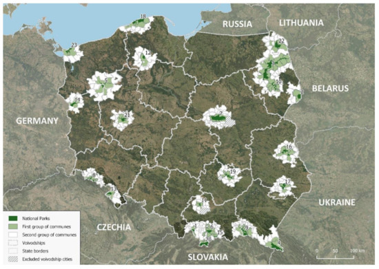 To achieve the objectives of the work, the research area is determined on the basis of communes (gminas—basic administrative units in Poland). Communes correspond to Local Administrative Units (LAUs), introduced in the European Union in 2017, also the components of NUTS. The study comprises 384 communes divided into two groups. The first group represents communes with national parks. However, because of a number of the exclaves of particular parks (sometimes located several dozen kilometers from a given park and occupying a small area), it is assumed that the park area within its boundaries must exceed 0.05% of its total area. A national park, as defined by the Act of 16 April 2004 on the conservation of nature [51], is an area characterized by unique natural, scientific, social, cultural, and educational values, having an area of not less than 1000 hectares, in the territory of which the entire nature and landscape values are subject to protection. The number of national parks is determined by an annex to the Act, which identifies 23 parks (Figure 2). This study presents 107 communes with this form of protection (communes with parks). The second group comprises entities that neighbor communes from the first group or those whose area of at least 50% is located within a 20 km buffer from the boundary of a park. The number of such communes is 277, which serve as a reference for the first group (a benchmark).