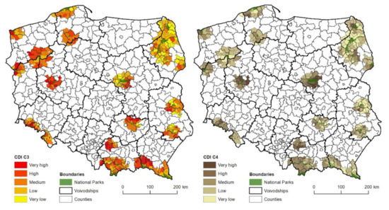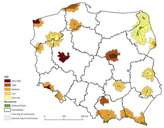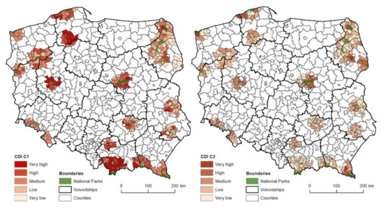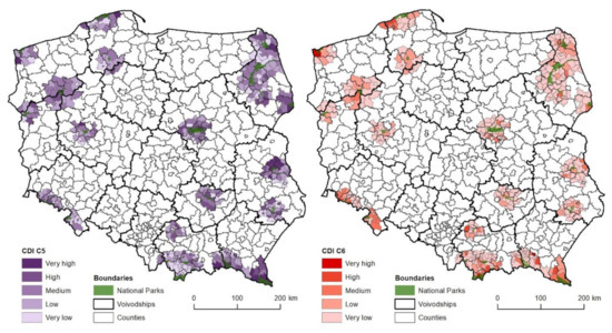 The values of CDI and CDIC1-6 are presented for communes using a cartogram method—a cartographic quantitative method. The division of data is based on the Jenks natural breaks classification method [82]. It consists in the grouping of data, which minimizes changeability while maximizing between-class variance. As a result, the boundaries of ranges are situated in the place of “natural breaks” in the statistical distribution of variables. This method assumes that a constant number of units and constant range of classes are not maintained.